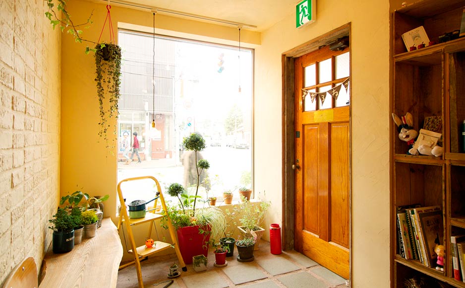 施術室との間仕切りもリンゴ箱をランダムに積み上げる事で壁のような圧迫感もなく家具のように存在し柔らかに空間を隔てる事に成功した。